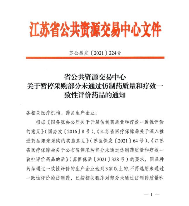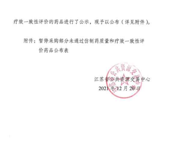 【江苏】江苏省公共资源交易中心关于暂停采购部分未通过仿制药质量和疗效一致性评价药品的通知(20211220)