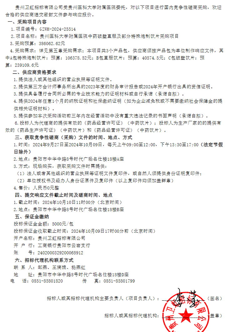 【贵州医科大学附属医院】贵州医科大学附属医院中药破壁直服及部分特殊炮制饮片采购项目竞争性磋商公告