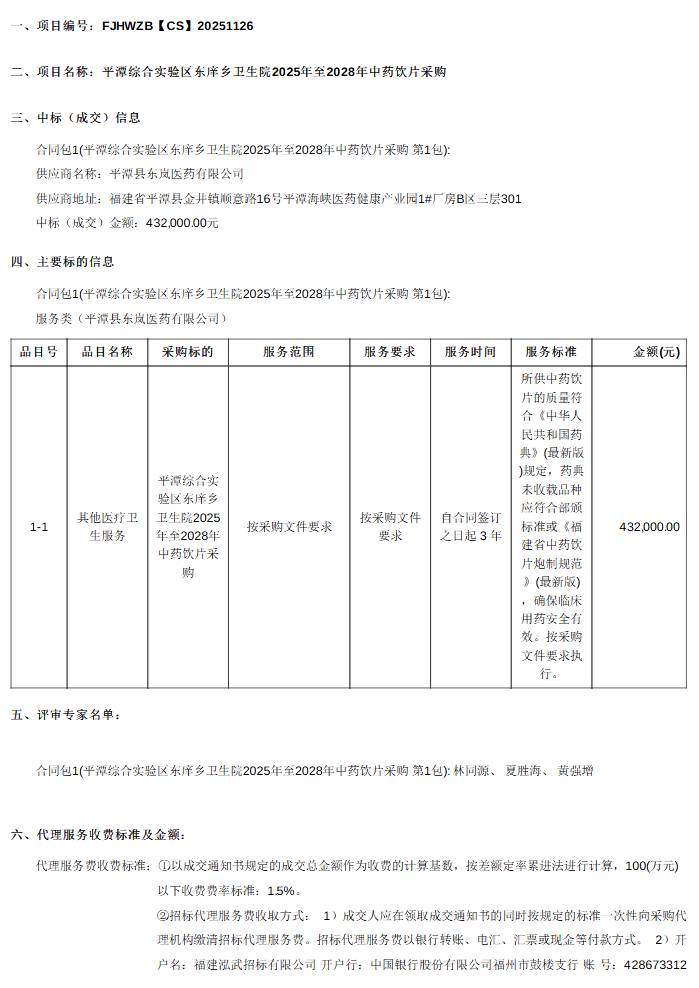【福州市平潭综合实验区东庠乡卫生院】福建省福州市平潭综合实验区东庠乡卫生院2025年至2028年中药饮片采购中标(成交)结果公告