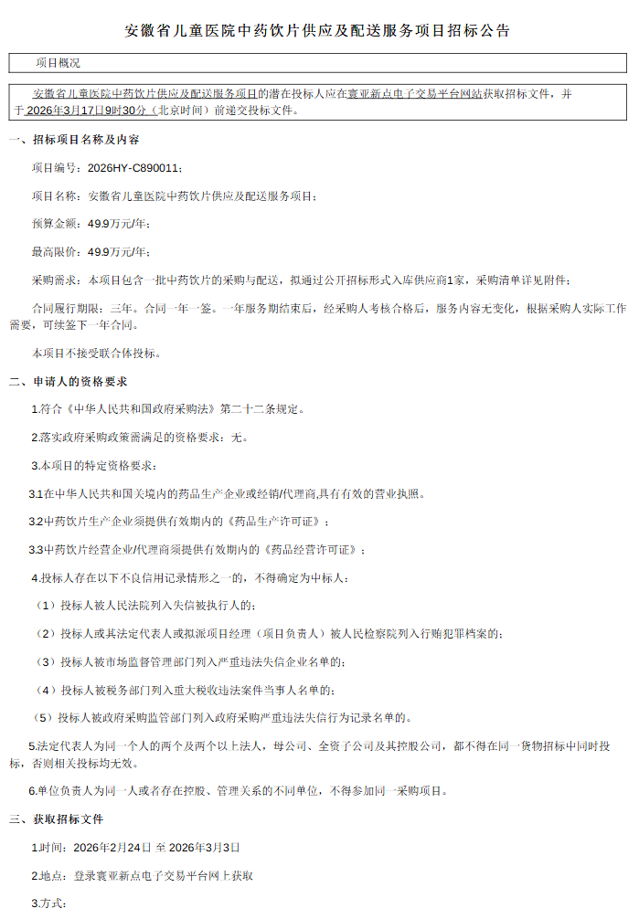 【安徽省儿童医院】安徽省儿童医院中药饮片供应及配送服务项目招标公告