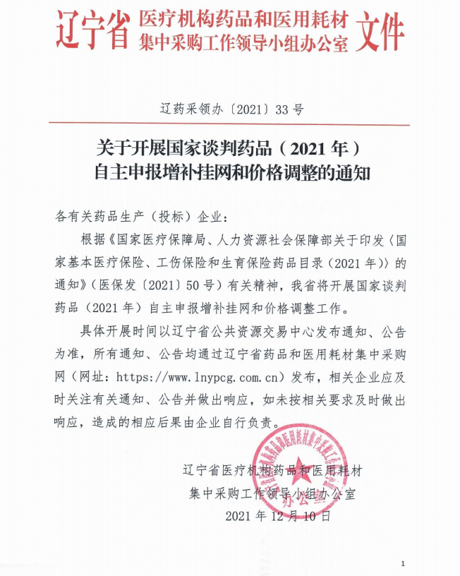 【辽宁】辽宁省关于开展国家谈判药品(2021年)自主申报增补挂网和价格调整的通知