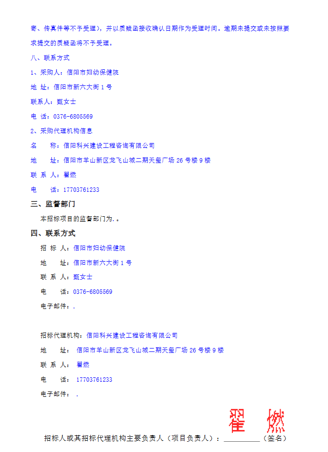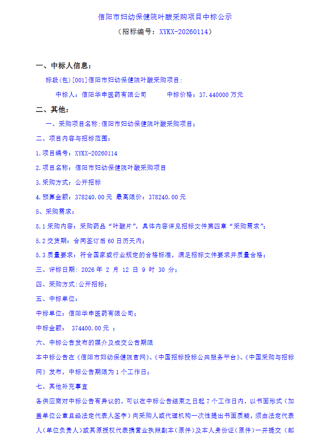 【信阳市妇幼保健院】河南省信阳市妇幼保健院叶酸采购项目中标公示