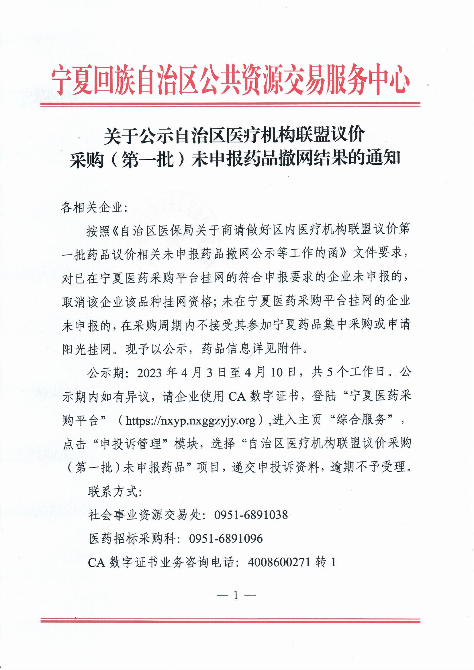 按照《自治区医保局关于商请做好区内医疗机构联盟议价第一批药品议价相关未申报药品撤网公示等工作的函》文件要求,对已在宁夏医药采购平台挂网的符合申报要求的企业未申报的,取消该企业该品种挂网资格;未在宁夏医药采购平台挂网的企业未申报的,在采购周期内不接受其参加宁夏药品集中采购或申请阳光挂网。现予以公示,药品信息详见附件。