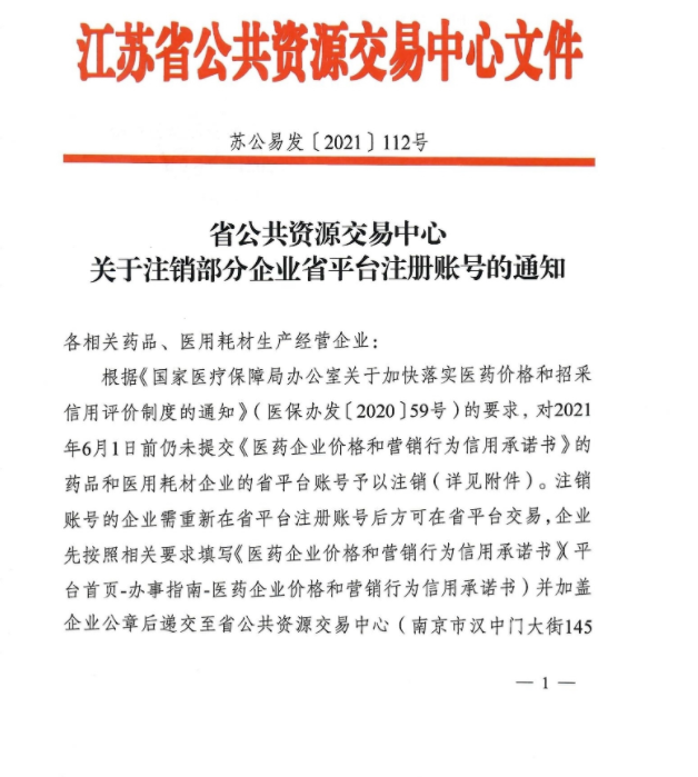 【江苏】2021年江苏省公共资源交易中心关于注销部分企业省平台注册账号的通知 苏公易发[2021]112号