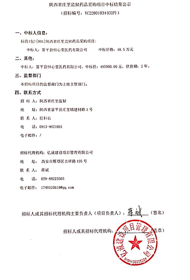 【陕西省庄里监狱】陕西省庄里监狱药品采购中标结果公示