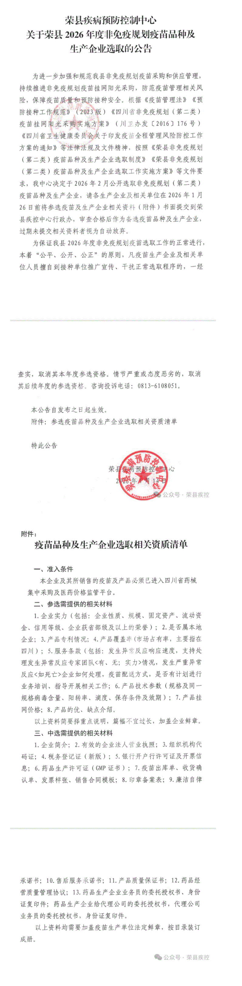 【自贡】荣县疾病预防控制中心关于荣县2026年度非免疫规划疫苗品种及生产企业选取的公告