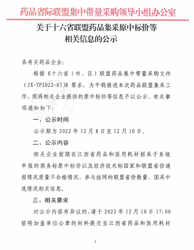 根据《十六省(市、区)联盟药品集中带量采购文件(JX-YP2022-03)》要求,为平稳推进本次药品联盟集采工作,现将相关企业提供的原中标价等信息予以公示。有关事项通知如下: