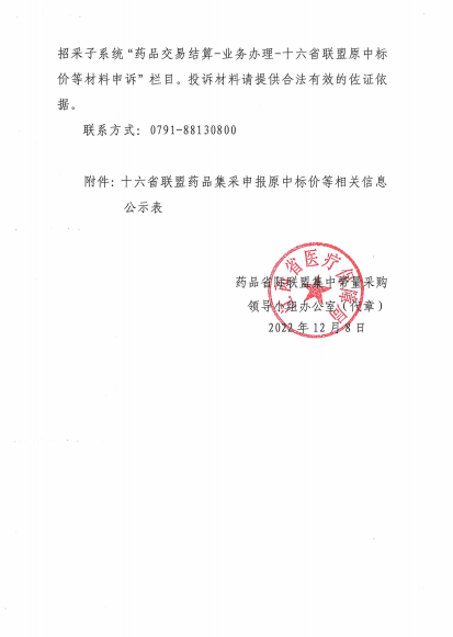 对公示内容有异议的,请于2022年12月10日17∶00 前将加盖单位公章的材料提交至江西省药品和医用耗材招采子系统“药品交易结算-业务办理-十六省联盟原中标价等材料申诉”栏目。投诉材料请提供合法有效的佐证依据。