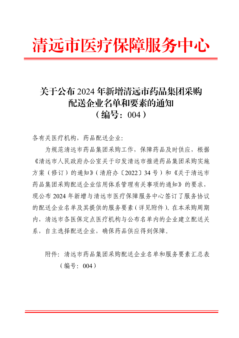 为规范清远市药品集团采购工作,保障药品及时供应,根据《清远市人民政府办公室关于印发清远市推进药品集团采购实施方案(修订)的通知》(清府办〔2022〕34号)和《关于清远市药品集团采购配送企业信用体系管理有关事项的通知》的要求,现公布2024年新增与清远市医疗保障服务中心签订了服务协议的配送企业名单及其提供的服务要素(详见附件)。在本采购周期内,清远市各医保定点医疗机构与公布名单内的企业建立配送关系,自主选择配送企业,确保药品供应得到保障。