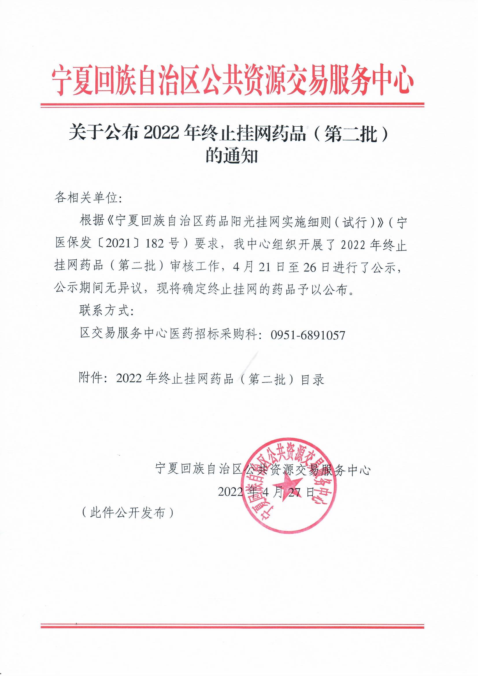 【宁夏】关于公布2022年终止挂网药品(第二批)的通知