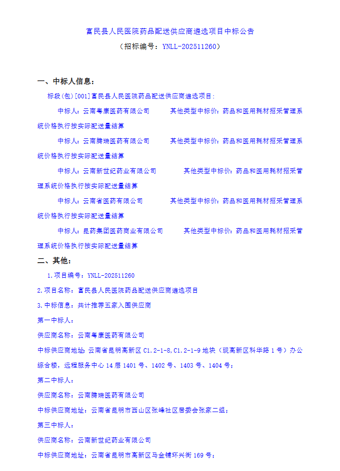 【昆明市富民县人民医院】云南省富民县人民医院药品配送供应商遴选项目中标公告