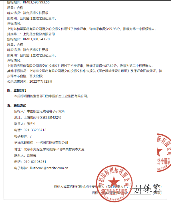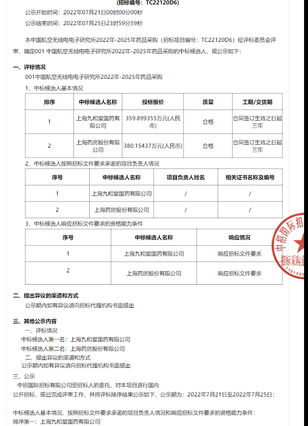 【中国航空无线电电子研究所】中国航空无线电电子研究所2022年-2025年药品采购-中标候选人公示