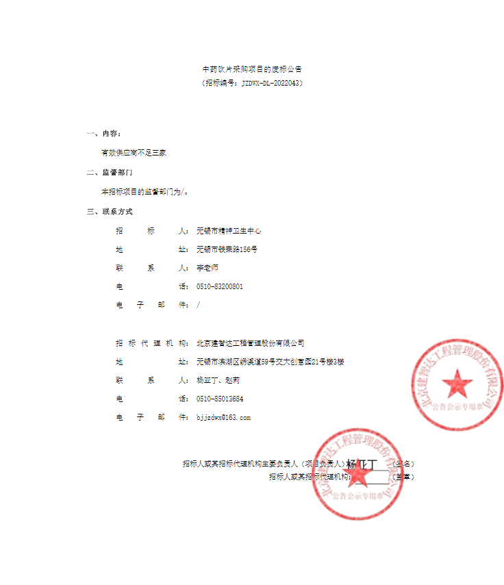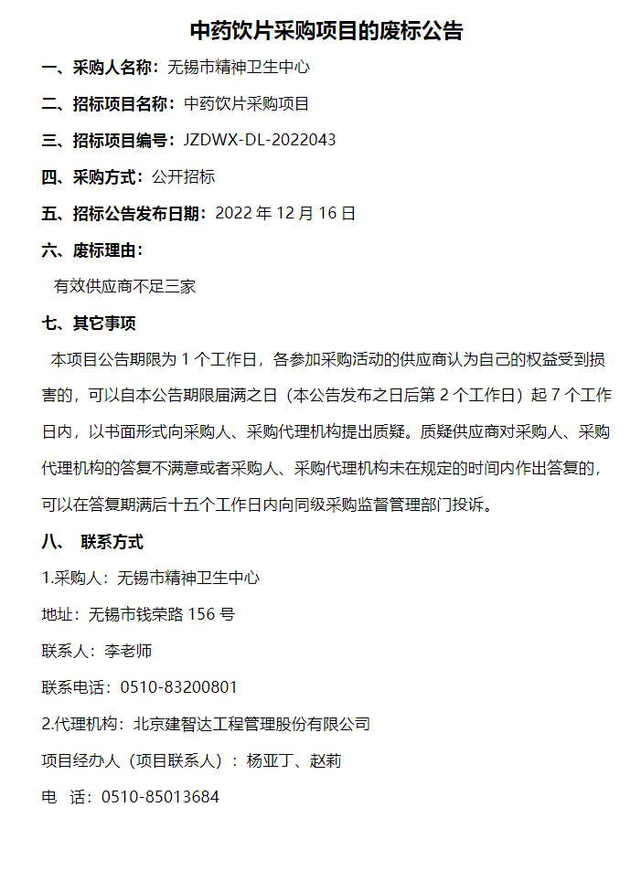 【无锡市精神卫生中心】江苏省无锡市精神卫生中心中药饮片采购项目的废标公告