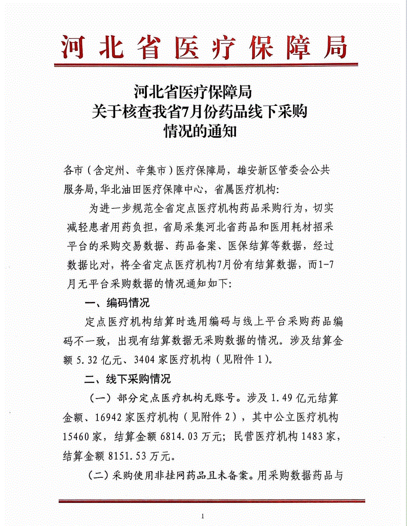 【河北】河北省关于核查我省7月份药品线下采购情况的通知