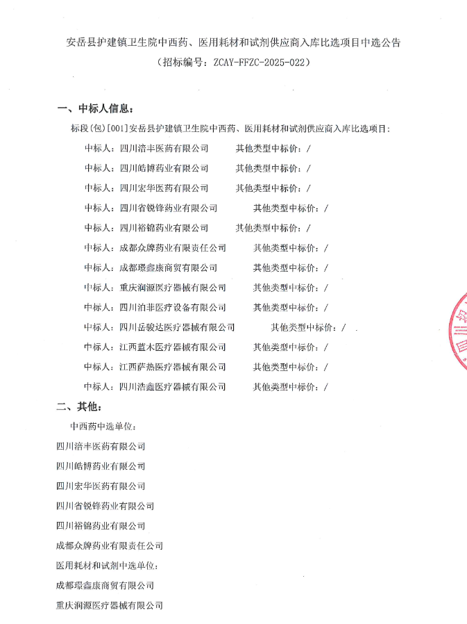 【资阳市安岳县护建镇卫生院】四川省资阳市安岳县护建镇卫生院中西药、医用耗材和试剂供应商入库比选项目中选公告