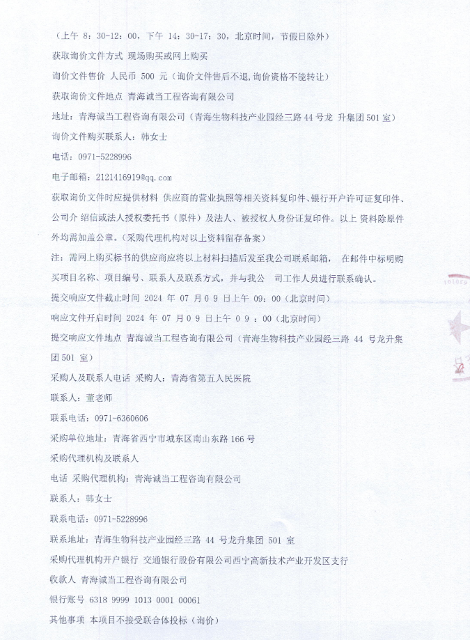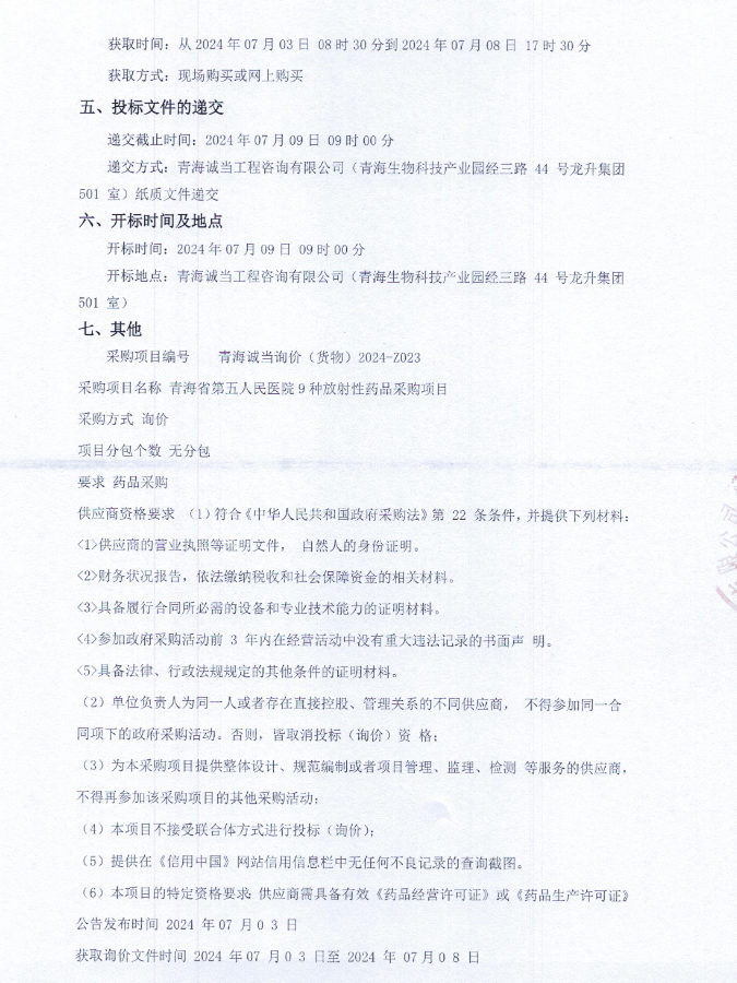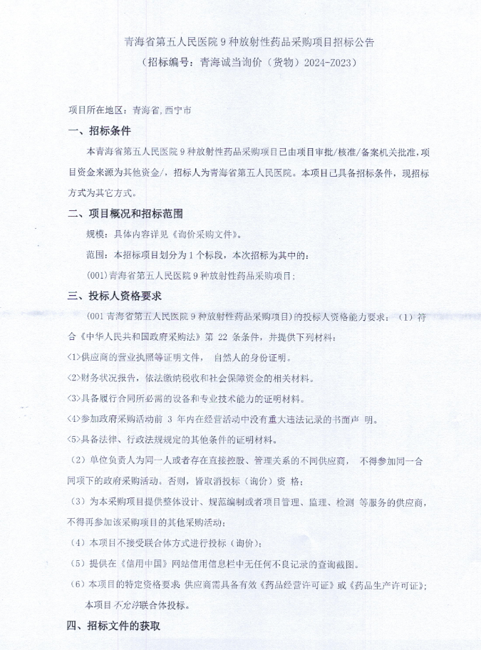 【青海省第五人民医院】青海省第五人民医院9种放射性药品采购项目招标公告