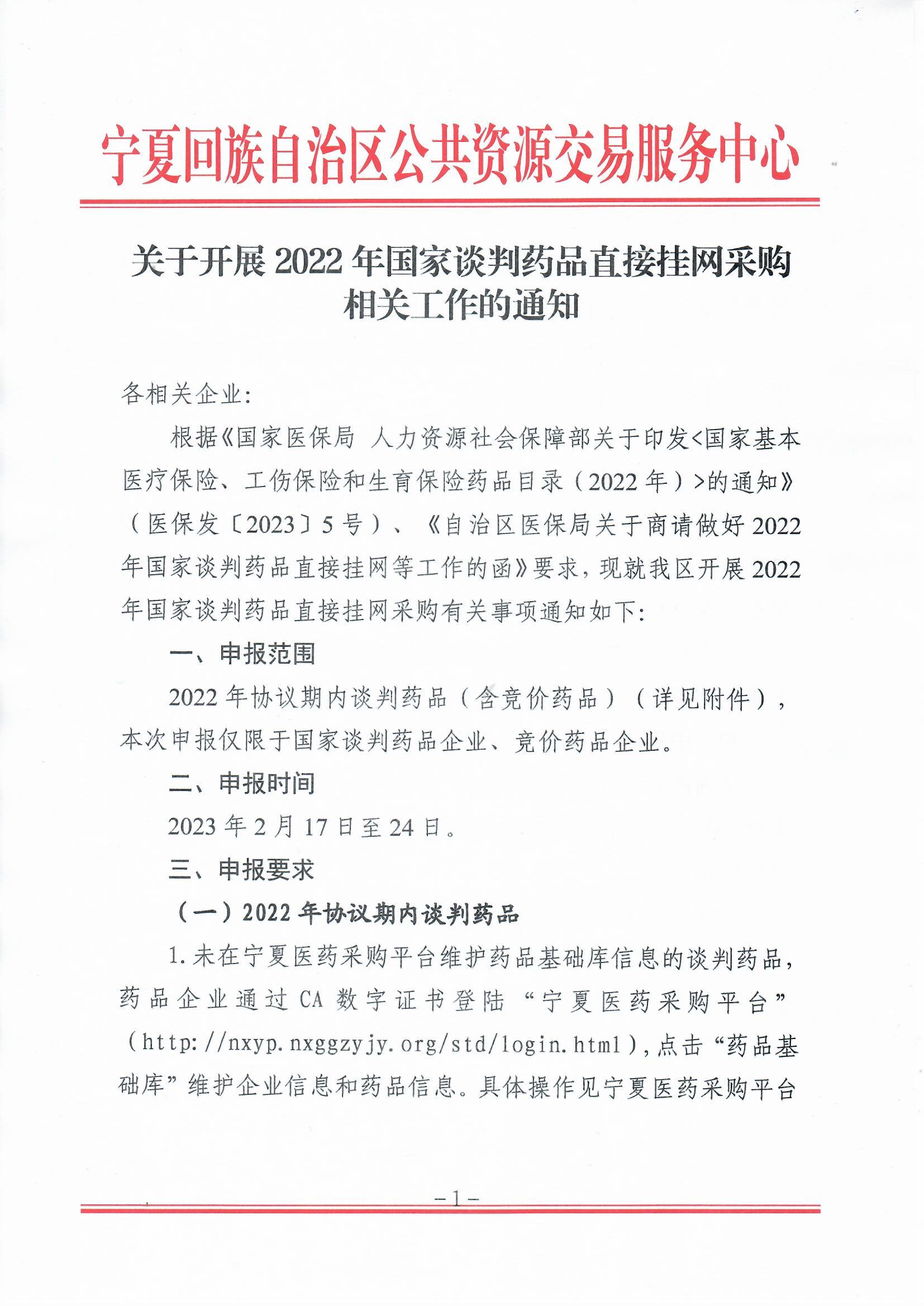 根据《国家医保局 人力资源社会保障部关于印发<国家基本医疗保险、工伤保险和生育保险药品目录(2022年)>的通知》(医保发〔2023〕5号)、《自治区医保局关于商请做好2022 年国家谈判药品直接挂网等工作的函》要求,现就我区开展2022 年国家谈判药品直接挂网采购有关事项通知如下: