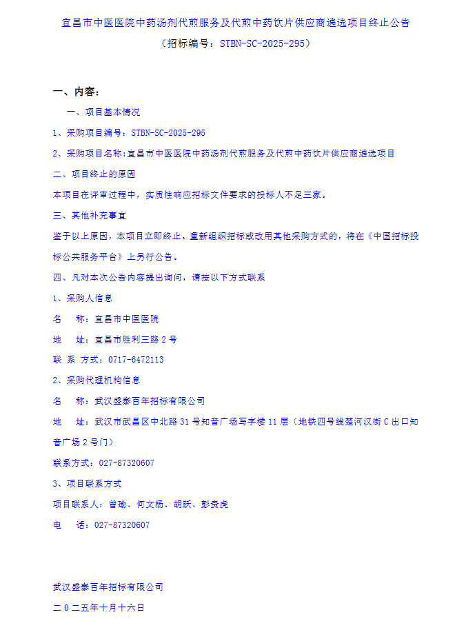 【宜昌市中医医院】湖北省宜昌市中医医院中药汤剂代煎服务及代煎中药饮片供应商遴选项目终止公告