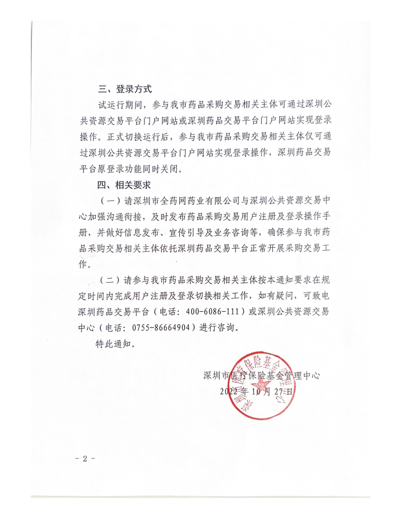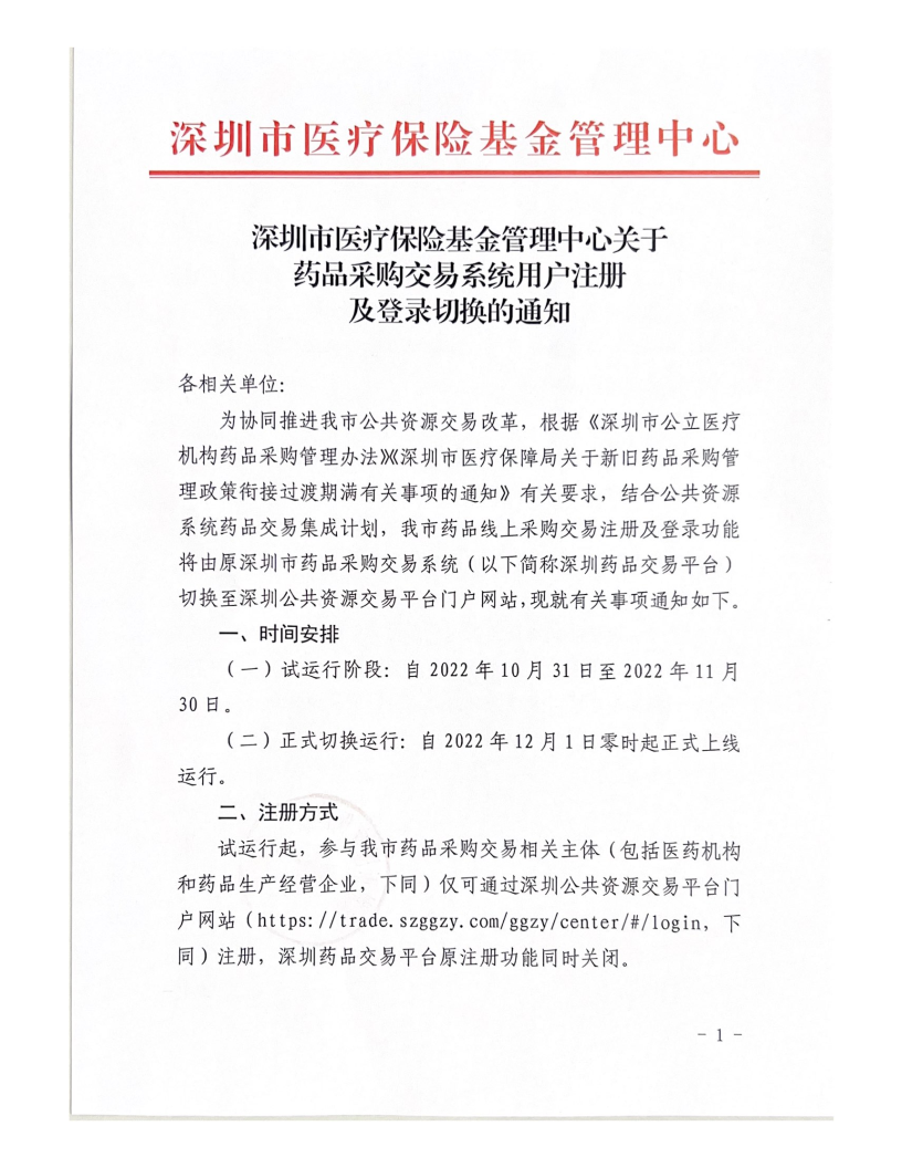 深圳市医疗保险基金管理中心于2022年10月27日印发了《深圳市医疗保险基金管理中心关于药品采购交易系统用户注册及登录切换的通知》,深圳药品交易平台现将该通知进行转发。