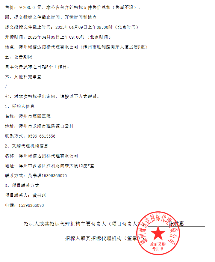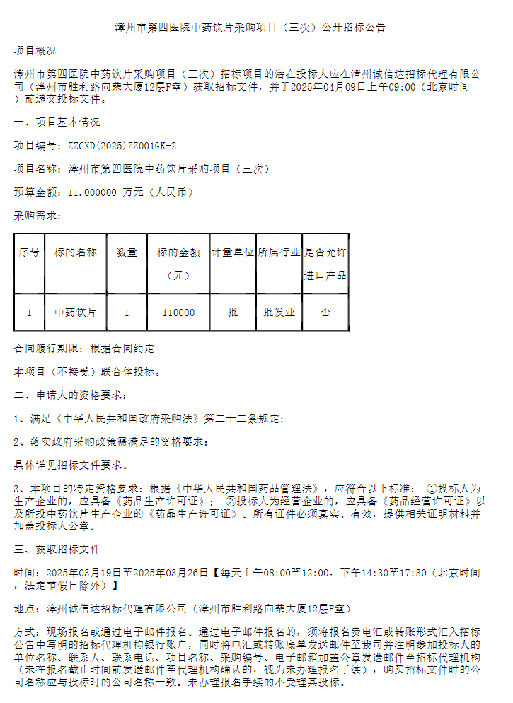 【漳州市第四医院】福建省漳州市第四医院中药饮片采购项目(三次)招标公告