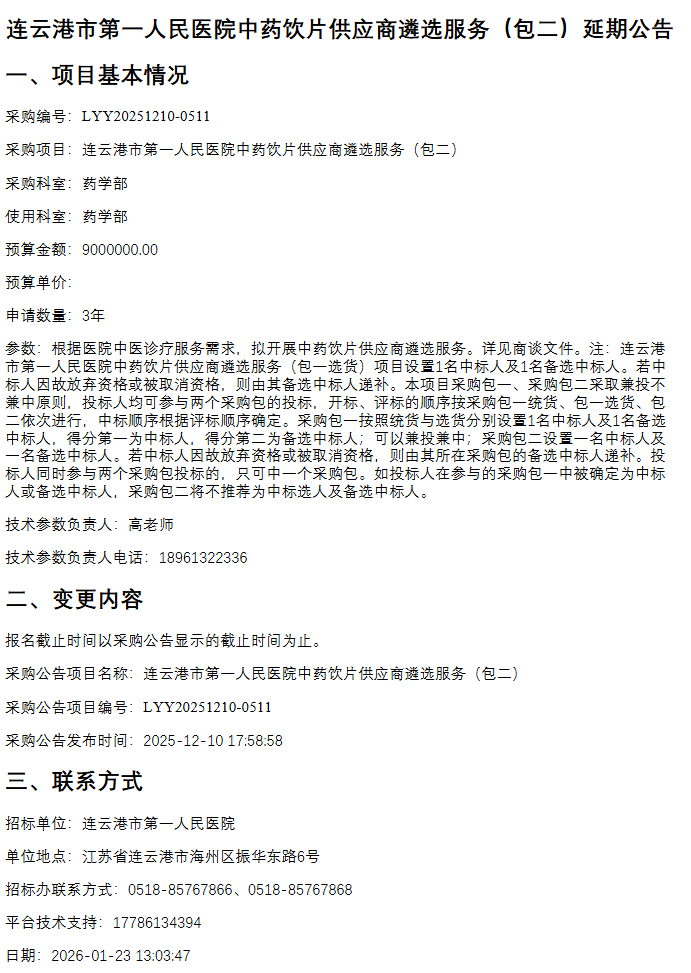 【连云港市第一人民医院】江苏省连云港市第一人民医院中药饮片供应商遴选服务(包二)延期公告
