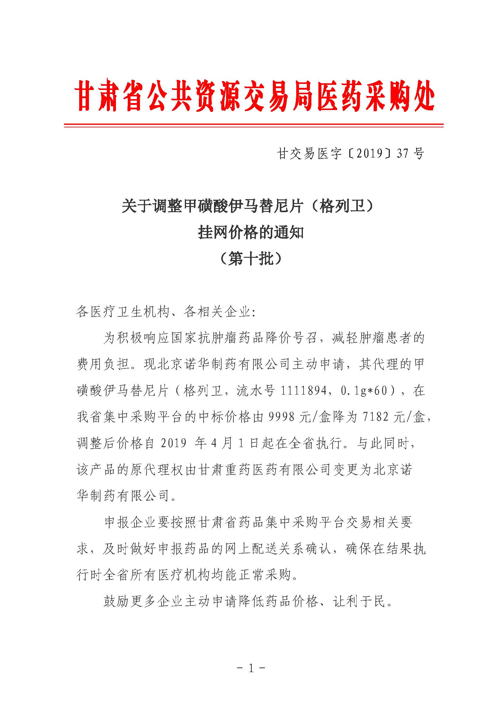 【甘肃】甘肃省关于调整甲磺酸伊马替尼片(格列卫)挂网价格的通知(第十批)