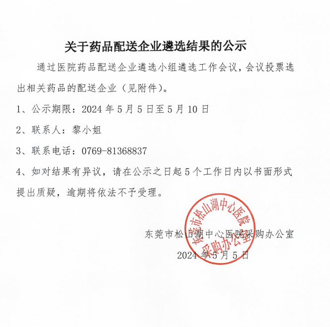 【东莞市松山湖中心医院】广东省东莞市松山湖中心医院药品配送企业遴选结果(2024.5.6)