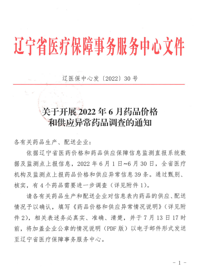 【辽宁】关于开展2022年6月药品价格和供应异常药品进行调查的通知