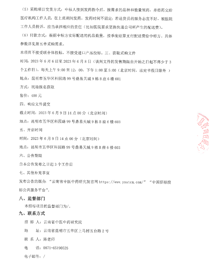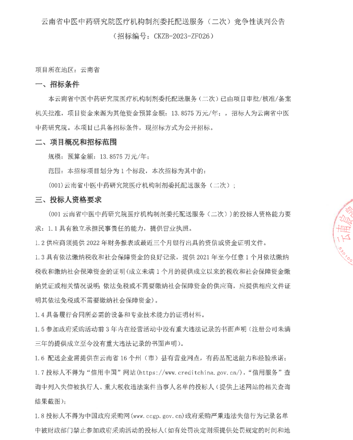 【云南省中医中药研究院】云南省中医中药研究院医疗机构制剂委托配送服务(二次)竞争性谈判公告