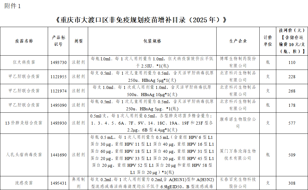 【重庆】2025年重庆市大渡口区非免疫规划疫苗增补公示