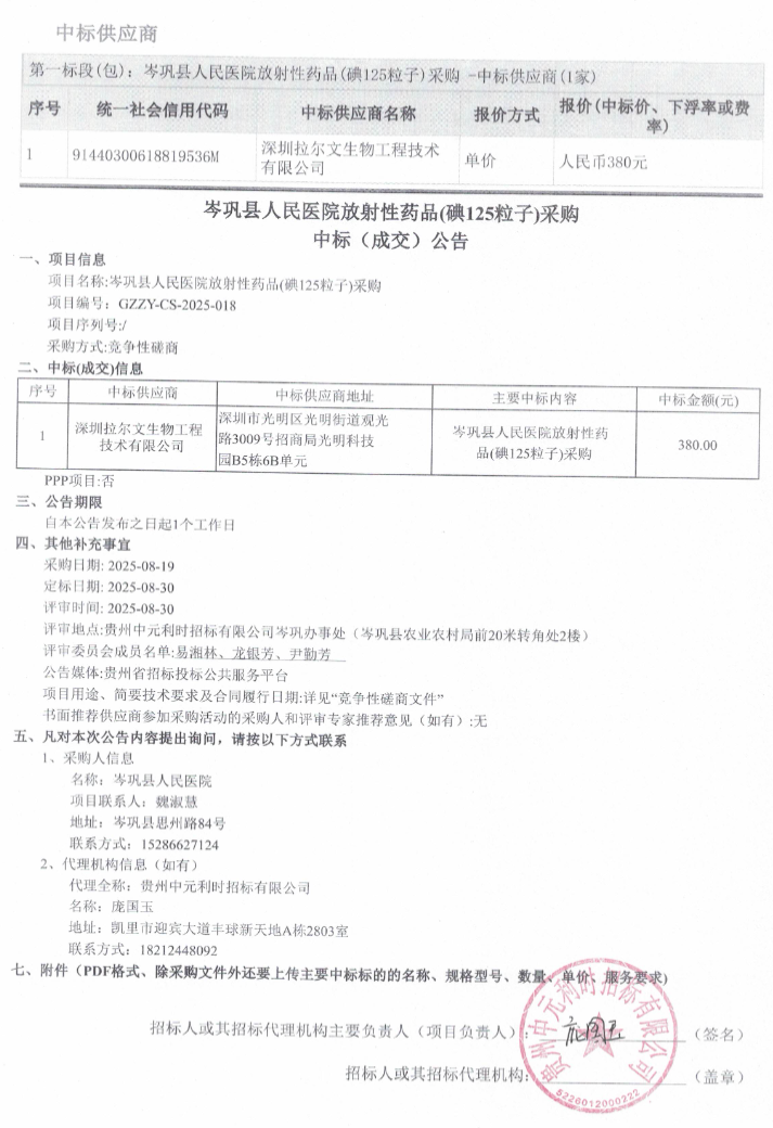 【黔东南苗族侗族自治州岑巩县人民医院】贵州省黔东南苗族侗族自治州岑巩县人民医院放射性药品(碘125粒子)采购中标(成交)公示