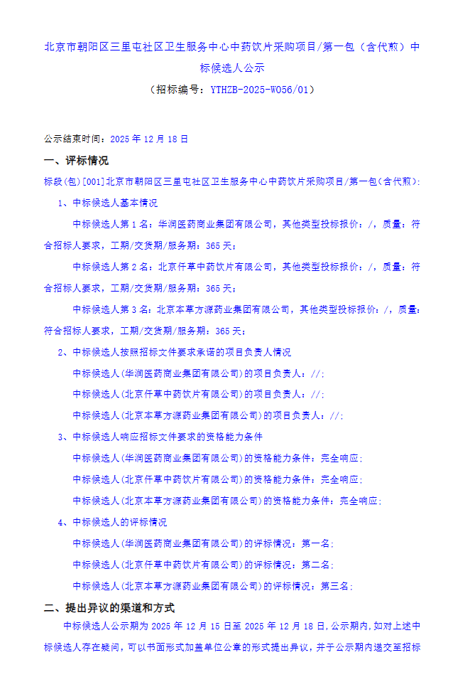 【北京市朝阳区三里屯社区卫生服务中心】北京市朝阳区三里屯社区卫生服务中心中药饮片采购项目/第一包(含代煎)中标候选人公示