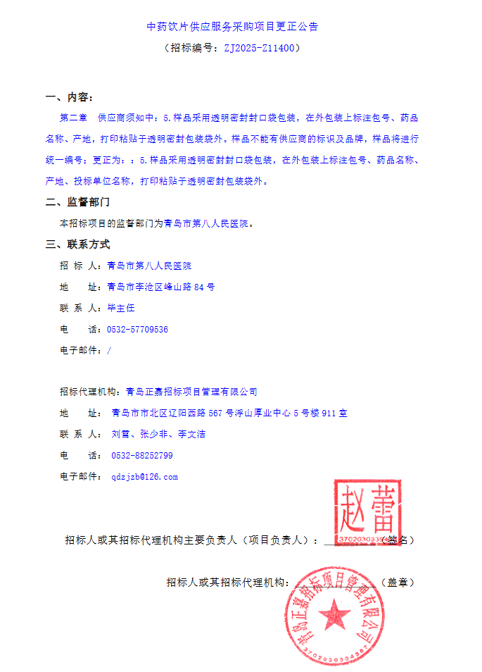 【青岛市第八人民医院】山东省青岛市第八人民医院中药饮片供应服务采购项目更正公告