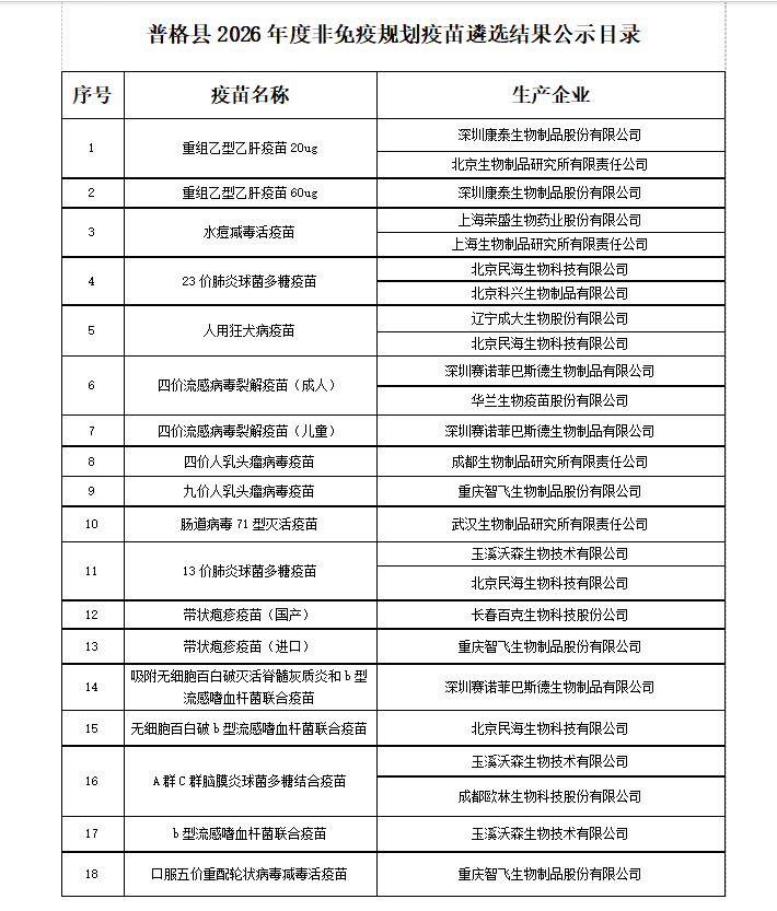 为进一步规范我县非免疫规划疫苗遴选和采购,保障用苗安全、有效、经济。根据《中华人民共和国疫苗管理法》《四川省卫生健康委员会关于印发疫苗全程管理风险防控工作方案(2023年版)(川卫疾控函〔2023〕11号)等要求,我县于2026年1月4日15时-17时召开全县2026年非免疫规划疫苗遴选会。以群众需求为导向,坚持公开、公平、公正的原则,按照质量优先、价格合理、保障供应的要求,科学、规范地开展遴选工作。经过县境内使用非免疫规划疫苗的5家预防接种单位代表现场不记名投票,共产生18个品种25个厂家入选普格县2026年非免疫规划疫苗采购目录,现将遴选结果予以公示。