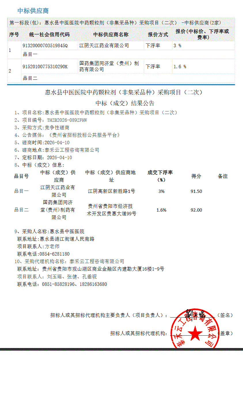 【黔南布依族苗族自治州惠水县中医医院】贵州省黔南布依族苗族自治州惠水县中医医院中药颗粒剂(非集采品种)采购项目(二次)中标(成交)结果公告