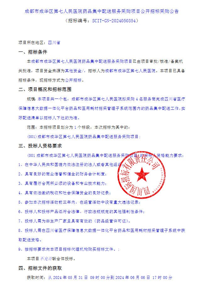 【成都市成华区第七人民医院】四川省成都市成华区第七人民医院药品集中配送服务采购项目公开招标采购公告