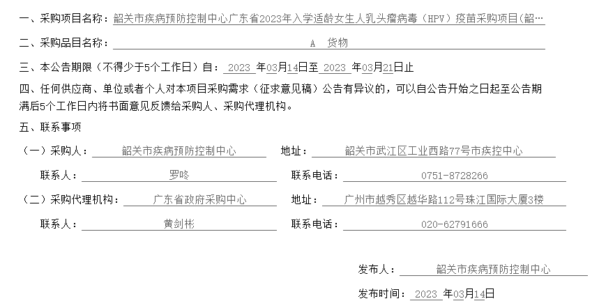 【韶关市疾病预防控制中心】广东省韶关市疾病预防控制中心广东省2023年入学适龄女生人乳头瘤病毒(HPV)疫苗采购项目(韶关市)采购需求征求意见公告