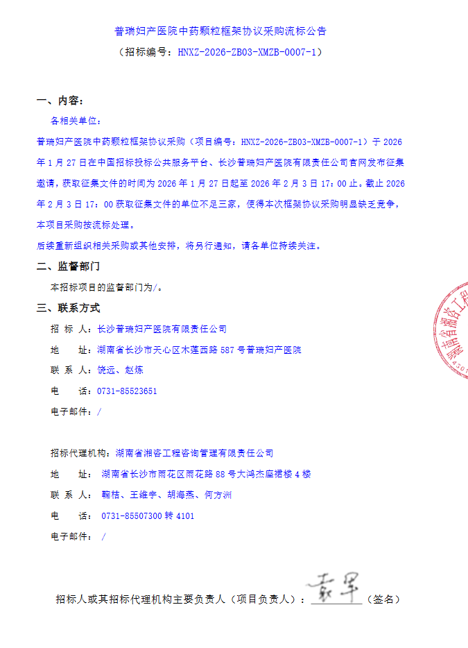【长沙市普瑞妇产医院】湖南省普瑞妇产医院中药颗粒框架协议采购流标公告