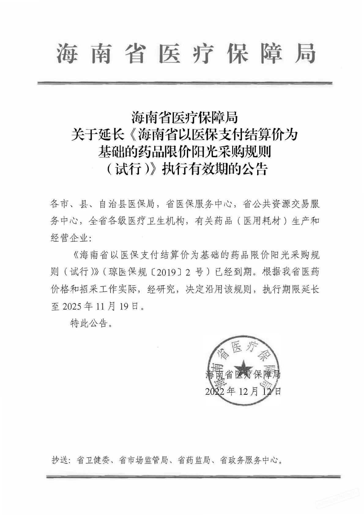 【海南】海南省医疗保障局关于延长《海南省以医保支付结算价为基础的药品限价阳光采购规则(试行)》执行有效期的公告