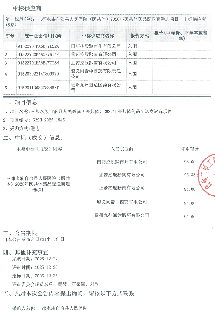 【黔南布依族苗族自治州三都水族自治县人民医院】贵州省三都水族自治县人民医院(医共体)2026年医共体药品配送商遴选项目成交结果公告