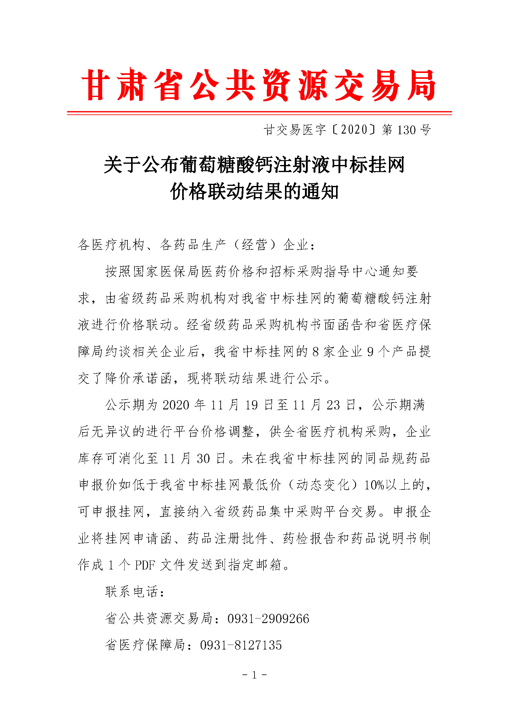 【甘肃】甘肃省关于公布葡萄糖酸钙注射液中标挂网价格联动结果的通知