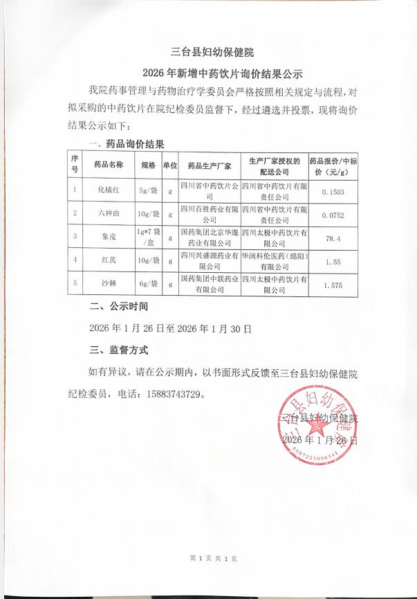 【绵阳市三台县妇幼保健院】四川省绵阳市三台县妇幼保健院2026年新增中药饮片询价结果公示