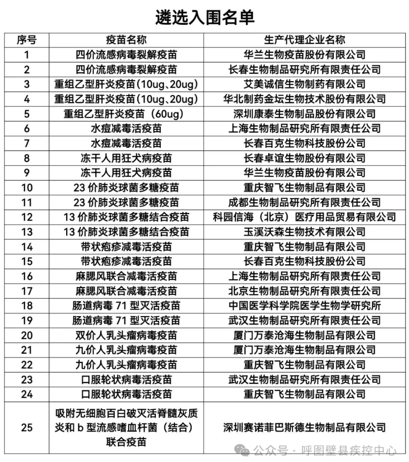 为加强我县非免疫规划疫苗采购、储运、使用等各环节管理工作,确保我县非免疫规划疫苗使用的科学规范、安全有效,呼图壁县非免疫规划疫苗遴选小组专家根据《呼图壁县非免疫规划疫苗采购实施方案》,于2026年1月19日通过产品资质、配送企业资质、产品特点、价格、售后服务、退换货承诺、效果与安全等重点内容进行综合评审,根据评审结果,现将遴选入围名单进行公示,接受社会监督,如有不同意见,请在公示期内向呼图壁县疾病预防控制中心反映。