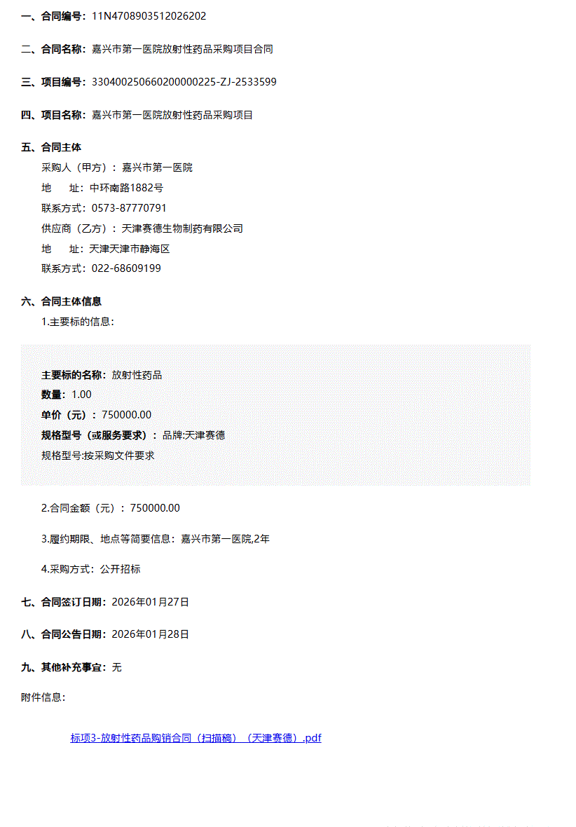 【嘉兴市第一医院】浙江省嘉兴市第一医院放射性药品采购项目合同公告