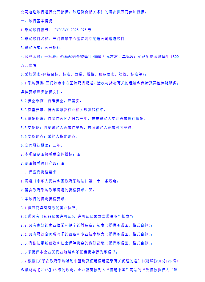 【三门峡市中心医院】河南省三门峡市中心医院药品配送公司遴选项目招标公告