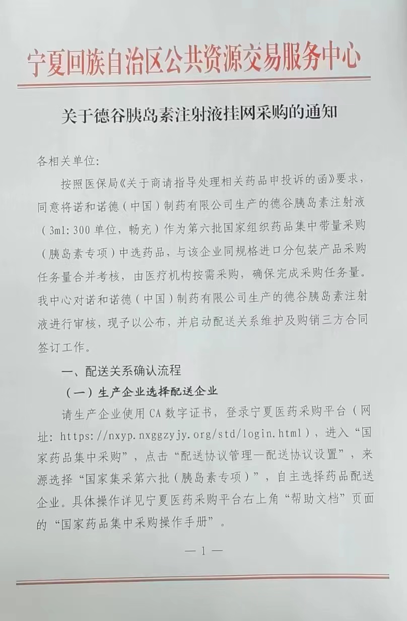 按照医保局《关于商请指导处理相关药品申投诉的函》要求,同意将诺和诺德(中国)制药有限公司生产的德谷胰岛素注射液(3ml:300单位,畅充)作为第六批国家组织药品集中带量采购(胰岛素专项)中选药品,与该企业同规格进口分包装产品采购任务量合并考核,由医疗机构按需采购,确保完成采购任务量。我中心对诺和诺德(中国)制药有限公司生产的德谷胰岛素注射液进行审核,现予以公布,并启动配送关系维护及购销三方合同签订工作。