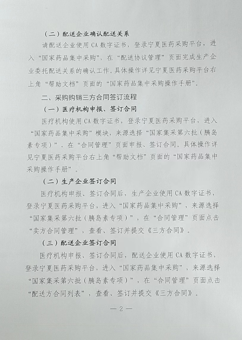 医疗机构使用CA数字证书,登录宁夏医药采购平台,进入“国家药品集中采购”模块,来源选择“国家集采第六批(胰岛素专项)”,在“合同管理”页面申报、签订合同。具体操作详见宁夏医药采购平台右上角“帮助文档”页面的“国家药品集中采购操作手册”。
