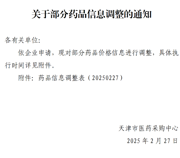 【天津】天津市关于部分药品信息调整的通知(20250227)