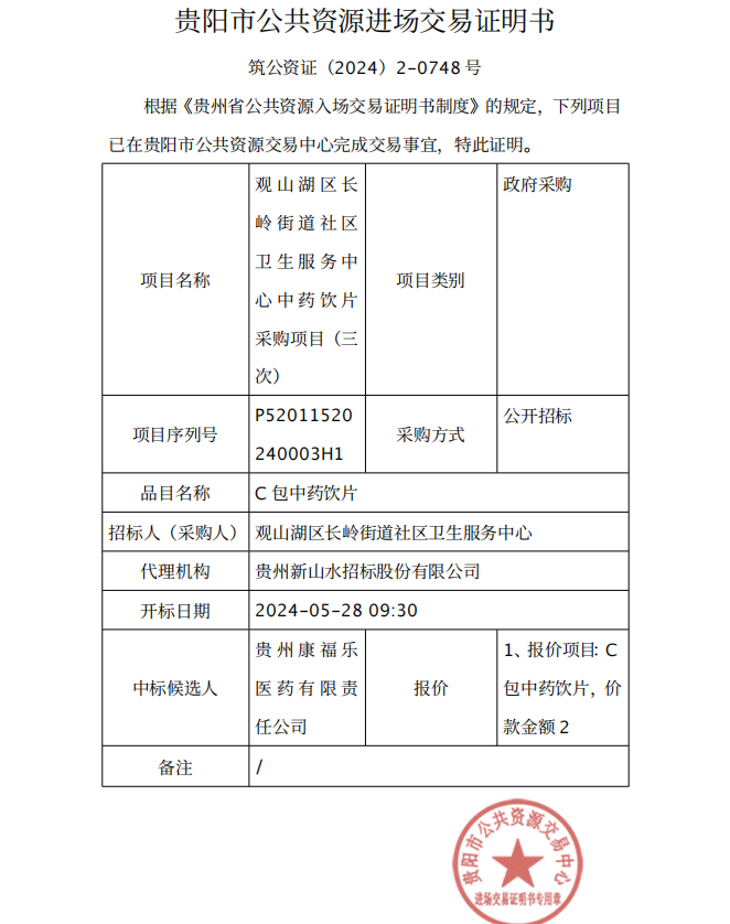 【贵阳市观山湖区长岭街道社区卫生服务中心】观山湖区长岭街道社区卫生服务中心中药饮片采购项目(三次)-C包中药饮片交易证明书