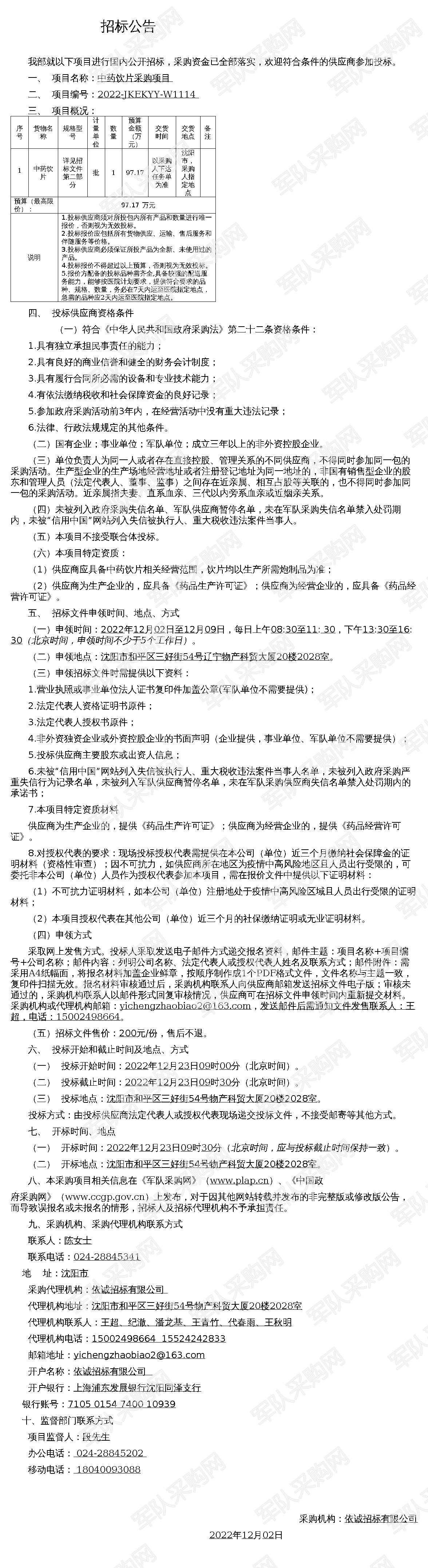 【军队采购】军队采购网中药饮片采购项目招标公告(2022-JKEKYY-W1114)
